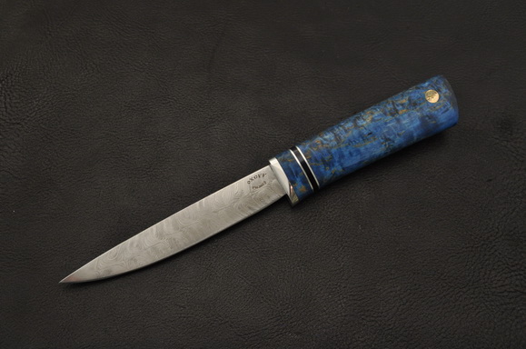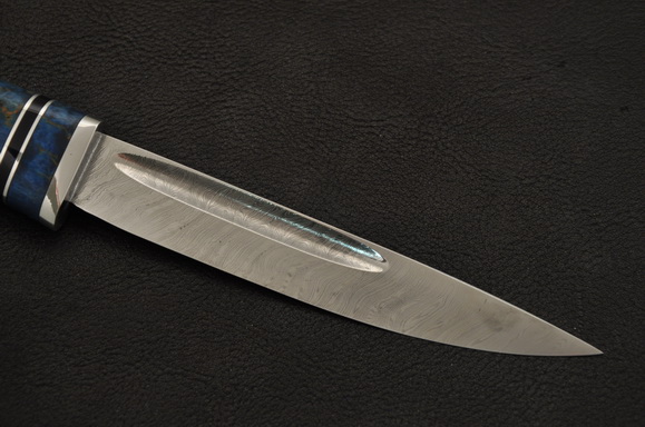 Клинок: дамасская сталь, спуски прямые, односторонний дол, твердость 58-60 .