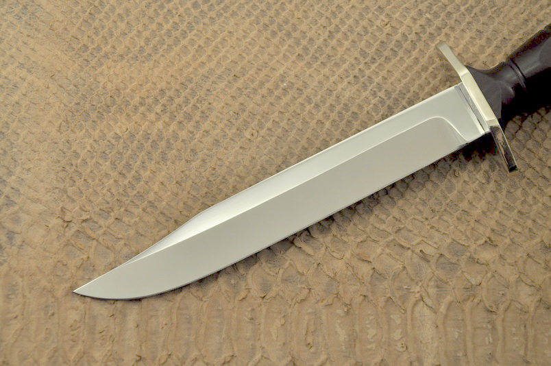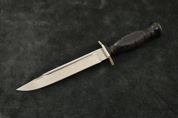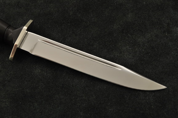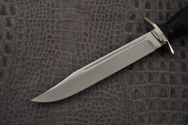 Клинок: кованая корозионностойкая легированная сталь Х12МФ, спуски бритвенные , долы, твердость 60HRC .