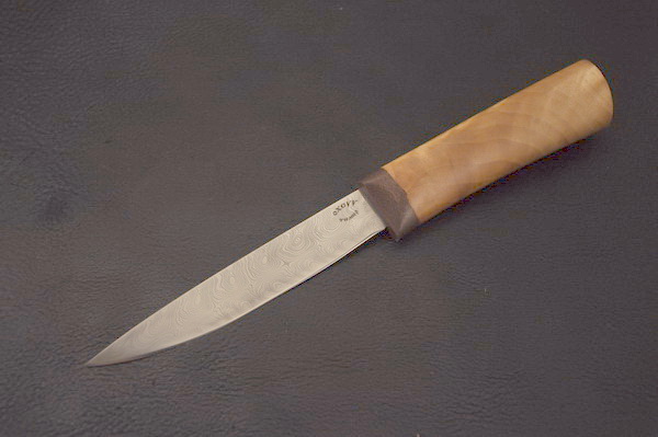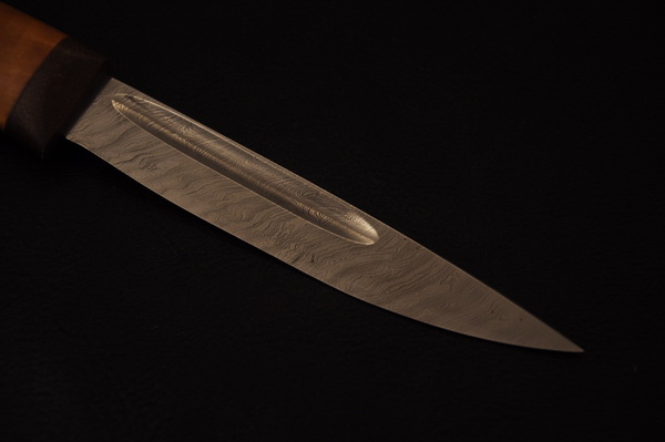 Клинок: дамасская сталь, односторонний дол, твердость 58-60 .