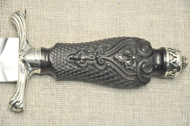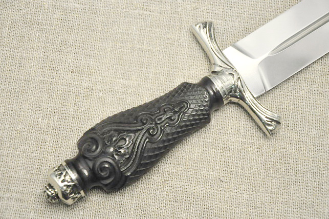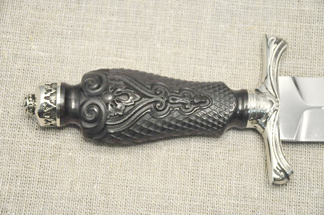 Клинок : кованая легированная сталь Х12МФ, полировка, ,твердость 59HRC, спуски вогнутая линза, не заточен. Рукоять: черный граб, резьба, черненый мельхиор , монтаж неразборный сквозной, (возможно изготовление разборной рукояти).
