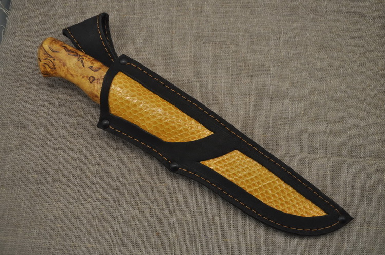 За дополнительную оплату для этого ножа можно приобрести авторские ножны с натуральной кожей змеи Ножны всадные , кожа натуральная , черный/желтый , 50х220 мм. , R-3795 - 1