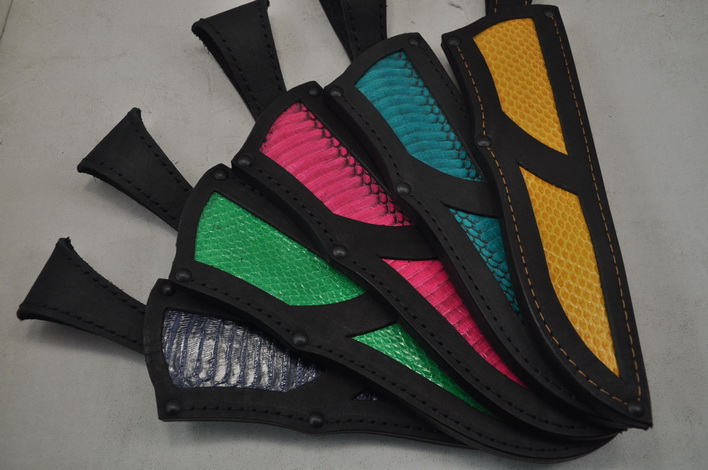 Все ножны выполнены из натуральной кожи особой обработки. Ножны прошиты нитками повышенной толщины со специальной пропиткой. Высокое качество материалов – кожи и нитей, обеспечивает надёжность и долговечность ножен .