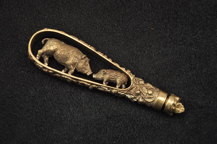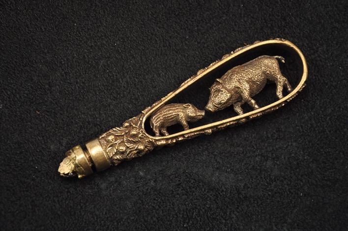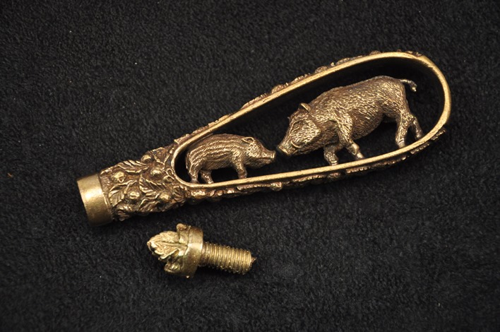 Комплект латунный из упора и навершия, чернение . Упор и рукоятка имеют литое резьбовое соединение, которое требует перенарезки, литая резьба без дополнительной обработки не закручивается.