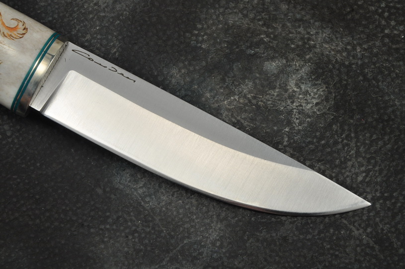 Клинок этого ножа изготовлен из стали Х12МФ, считающейся одной из лучших сталей для ножей по соотношению цена-качество. Сталь Х12МФ является корозионно-стойкой, мало уступая нержавеющим сталям по сопротивлению короззии, но при этом имеет значительно более высокие характеристике по длительности реза, что обусловлено наличием в стали Х12МФ повышающих прочность и твердость хрома и молибдена. Оптимальной твёрдостью для рабочего охотничьего ножа с клинком из стали Х12МФ является твёрдость 58-59 HRC.