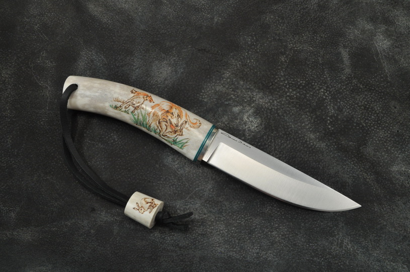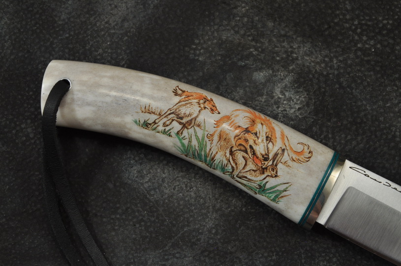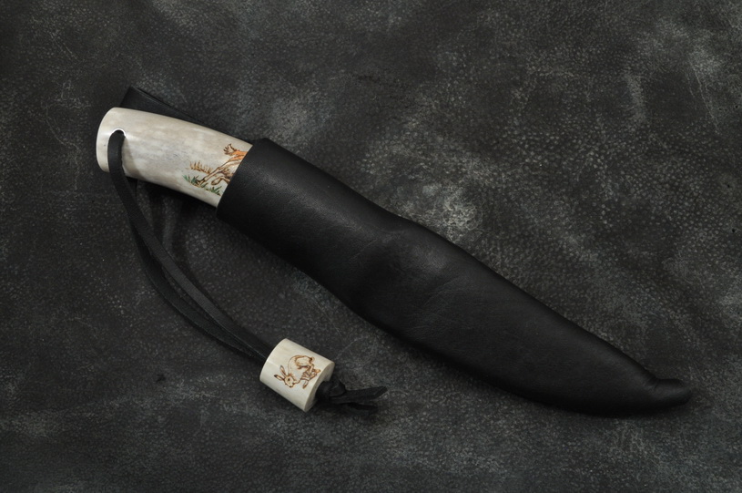 Рукоять: рог , пирография , мельхиор ; темляк кожа , рог .