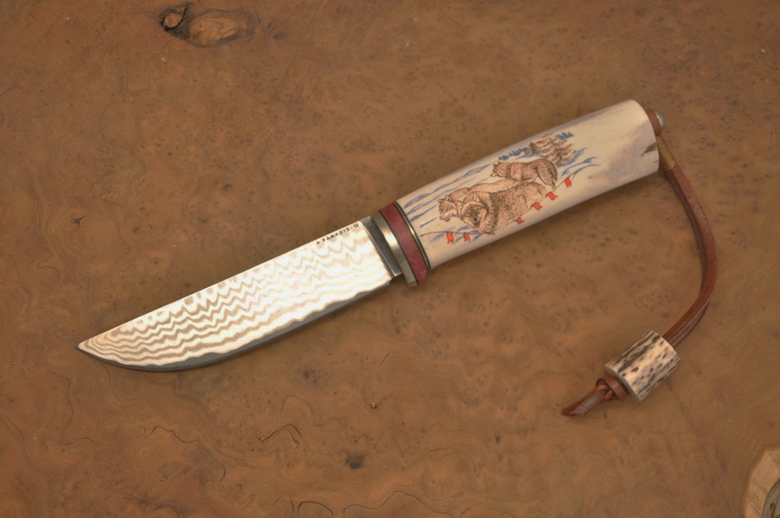 Рукоять: рог лося, пирография , нейзильбер , стабилизированная карельская береза, фибра, темляк кожаный .