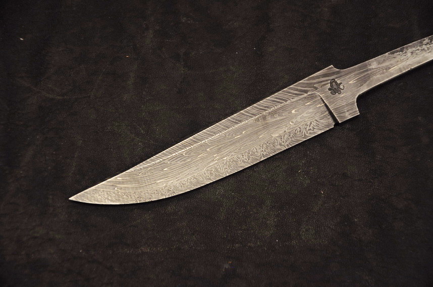 Клинок: мозаичный трёхрядный дамаск , состав пакета 65Г,ШХ15, 50А, никель, спуски вогнутая линза, зонный отпуск: твердость РК 58-60HRC, обух 55-56 HRC.