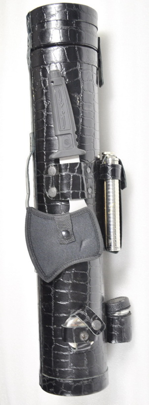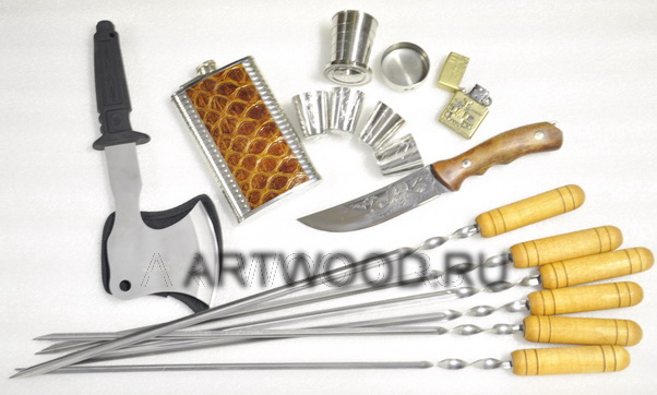 Удобный набор купить для приготовления шашлыка в поездке на природу, рыбалке , охоте , пикнике. Компактное размещение всех предметов , необходимых для организации походной стоянки , туристического лагеря , бивака - нож , топор, шампуры , зажигалка , фляжка , стопки , стакан в защитном чехле - тубусе .