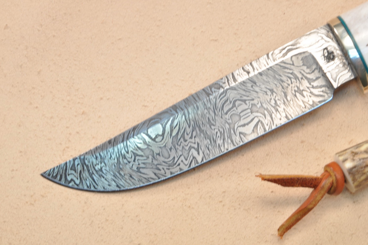 Клинок : кузнечная мастерская Матвеевых , мозаичный дамаск , состав пакета 65Г,ШХ15, 50А, спуски бритвенные, зонная закалка: твердость РК 59-60 HRC, обух 55-56 HRC.