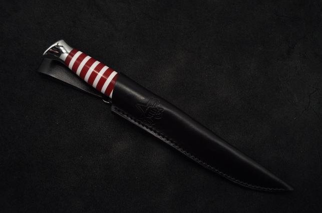 Универсальный легкий средней величины нож без упора. Неширокий прочный клинок толщиной 4 мм с приспущенным обушком имеет вогнутые линзовидные спуски более чем на половину ширины клинка, образующие тонкое лезвие. На голомени с обеих сторон клинка выбраны узкие долы, добавляющие жесткости клинку. Небольшая эргономичная рукоять на удивление хорошо ложится даже в большую ладонь. А расширенная головка рукояти хорошо способствует ловкому извлечению из ножен. Монтаж клинка сквозной не разборный. Заслуженно пользуется популярностью.