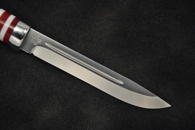 Сталь клинка : нержавеющая 95Х18, твердость HRC 58, спуски вогнутые, полировка, долы, заточка.