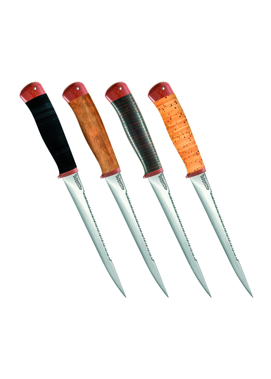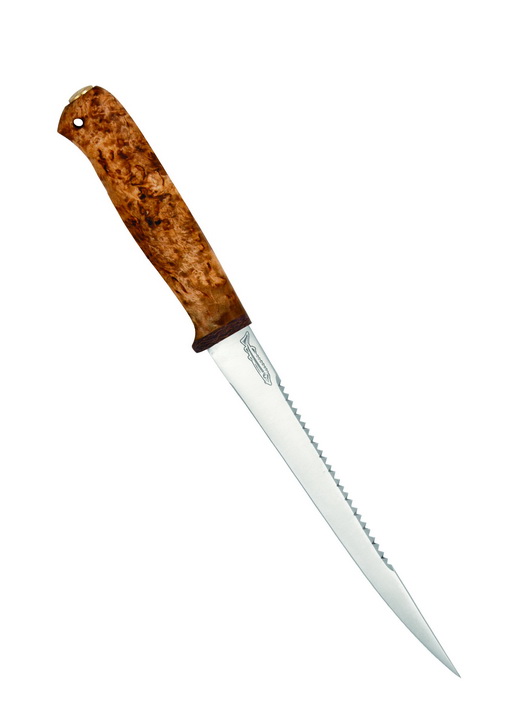Большой разделочный нож для крупной рыбы с узким клинком и пилообразной заточкой на обухе для чистки чешуи. Клинок толщиной 2 мм имеет прямые спуски образующие тонкое прекрасно режущее лезвие. Классическая форма рукояти уверенно и прочно лежит в любой ладони. А оптимальной величины гарда не дает соскользнуть пальцам при резах от себя. Монтаж клинка сквозной не разборный. Отличный выбор для разделки крупной рыбы.