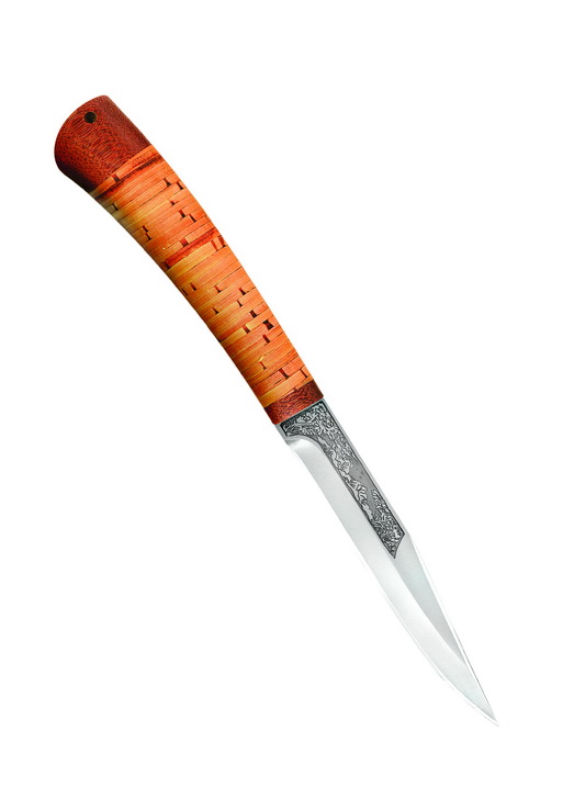 Небольшой универсальный и очень легкий нож с узким клинком классической формы заслуженно пользуется популярностью у приверженцев активного отдыха. Клинок имеет вогнутые линзовидные спуски от половины ширины клинка. При толщине обуха в 2,4 мм клинок имеет неширокую пяту. Ножом легко не только освежевать трофей, ошкурить, выпотрошить, разделать тушку, но и приготовить в лагере праздничный ужин. Удобная форма рукояти позволяет уверенно работать с мелкими трофеями, а сквозной монтаж придает ножу хорошую прочность. На навершии рукояти имеется отверстие под темляк. Прекрасный нож для разделки мелкого пушного зверя, боровой и водоплавающей дичи, а также рыбы.