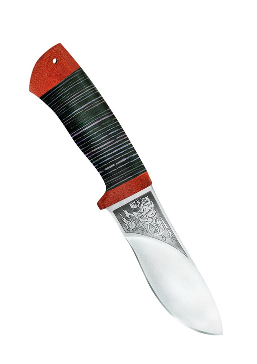 Хороший разделочный нож с широким клинком, имеющим пологие вогнутые линзовидные спуски от самого обуха образующие тонкое прекрасно режущее лезвие. Демонстрирует отличные режущие качества. Форма клинка типичная для скинера позволяет снимать шкуру разделываемого животного, не боясь повредить при этом брюшину. Клинок с толщиной обуха в 3 мм имеет большую пяту, что позволяет работать ножом при разделке разными хватами. Рукоять прочно ложится в ладонь. Монтаж клинка сквозной не разборный. Отличный выбор для разделочных работ на охоте и на ферме.