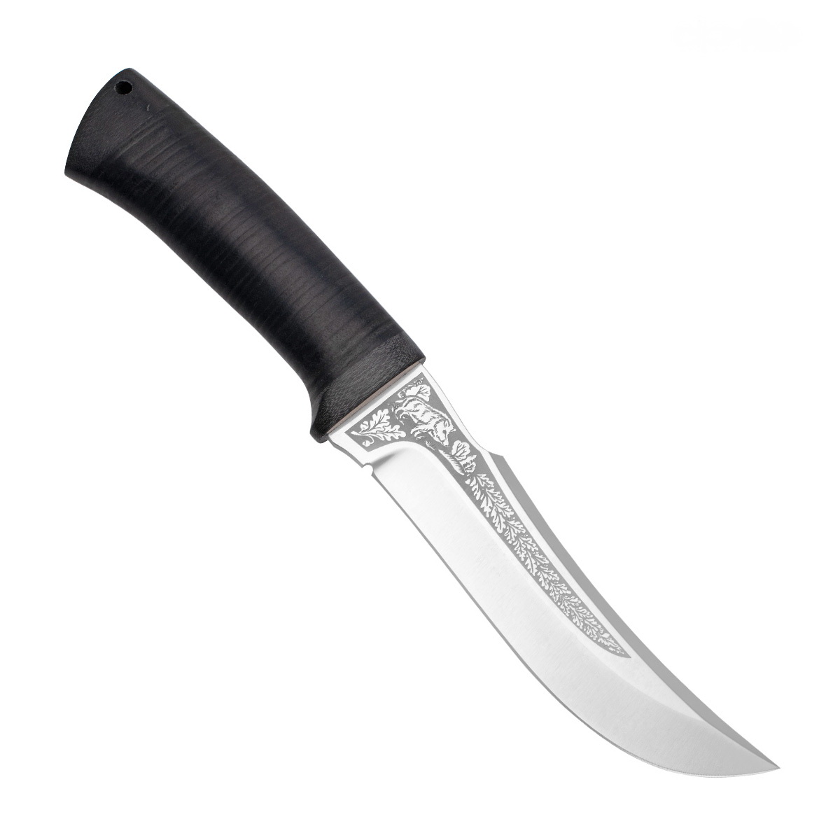 Крупный универсальный прочный нож с хищным клинком восточного ятаганного вида, имеющим вогнутые линзовидные спуски от середины ширины клинка образующие тонкое, прекрасно режущее лезвие. Демонстрирует отличные режущие качества. Весьма серьезный инструмент. Клинок толщиной обуха в 3,7 мм имеет прогнутое фальшлезвие на три четверти длины клинка, и может быть использовано для рубки мелких костей и хрящей. Эргономичная форма рукояти подкупает: она удобна даже для большой руки уверенно и прочно ложится в любую ладонь. А полноценная гарда не дает соскользнуть пальцам при резах от себя. Монтаж клинка сквозной не разборный. На навершии рукояти имеется отверстие под темляк. Отличный выбор для большинства видов работы в лесу.