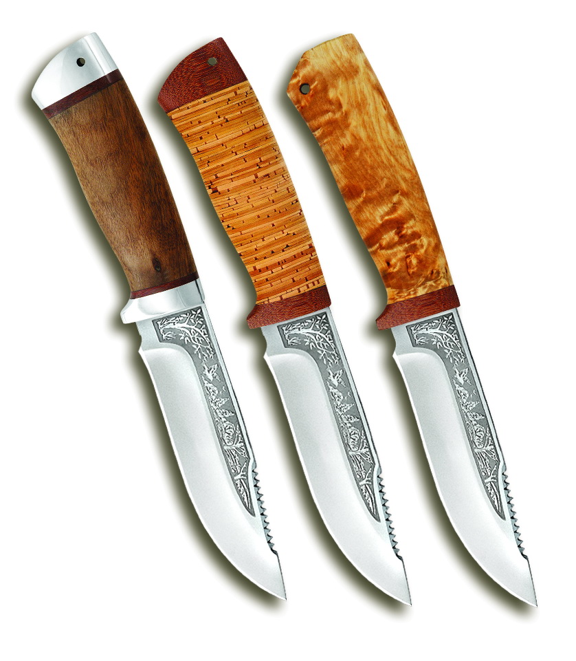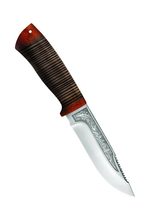 Солидный универсальный легкий и прочный нож с клинком классической формы, имеющим широкие вогнутые линзовидные спуски образующие тонкое прекрасно режущее лезвие. Демонстрирует отличные режущие качества. Поэтому в умелых руках становится весьма серьезным инструментом. Клинок с толщиной обуха в 2,4 мм имеет полноценную голомень, что придает ему дополнительную прочность. На нешироком фальшлезвии нанесена небольшая пилообразная заточка, которая позволяет надпиливать кости, хрящи или чистить чешую пойманной рыбы. Классическая форма рукояти подкупает: она удобна даже для большой руки уверенно и прочно ложится в любую ладонь. А оптимальной величины гарда не дает соскользнуть пальцам при резах от себя. Монтаж клинка сквозной не разборный. Отличный выбор для большинства видов работы в лесу. Имеет солидный отряд почитателей.