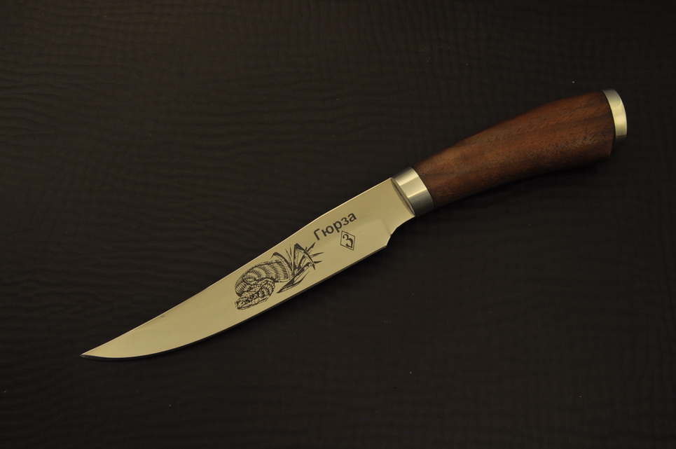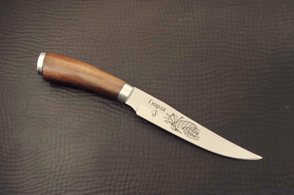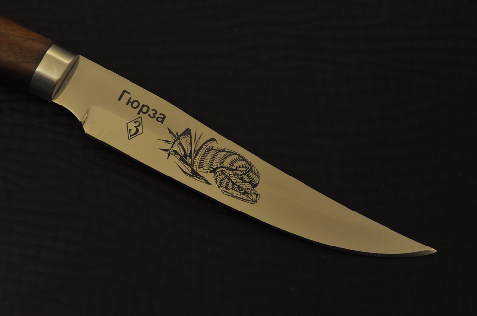 Клинок: нержавеющая сталь 65Х13, спуски бритвенные, гравировка, твердость 55 HRC
