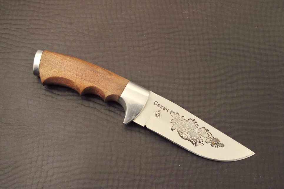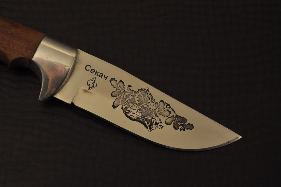 Клинок: нержавеющая сталь 65Х13, спуски бритвенные, гравировка, твердость 55 HRC