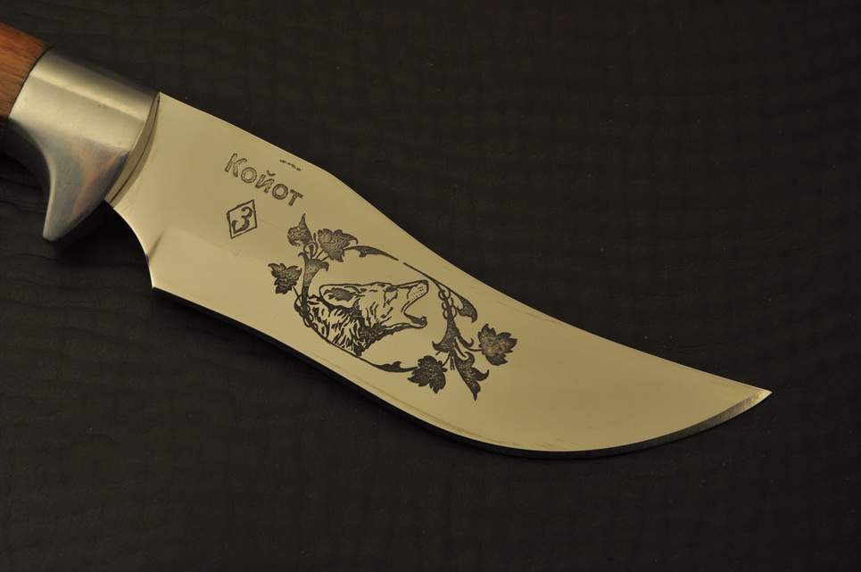 Клинок: нержавеющая сталь 65Х13, спуски бритвенные, гравировка, твердость 55 HRC