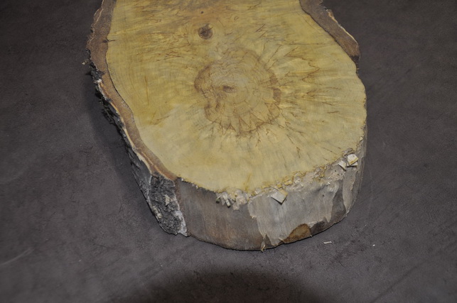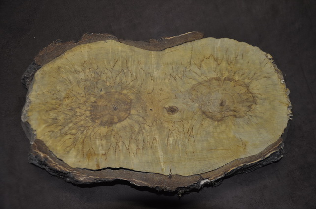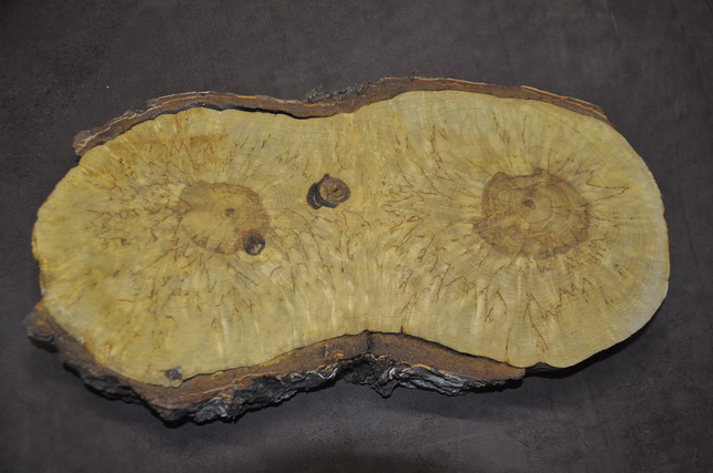 Карельская берёза , спил бревна с двумя сердцевинами, сушка естественная, выдержка 5 лет, возможно появление сердцевинных трещин, шлифовка пластей, без покрытия маслом, боковая сторона без обработки, частично с отслаивающейся корой.