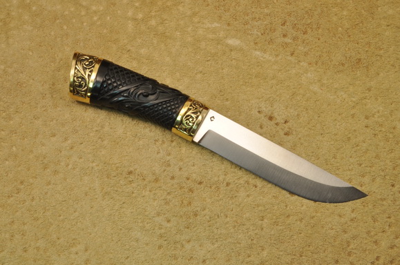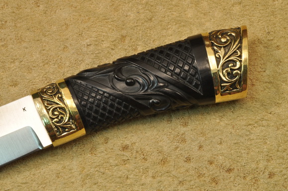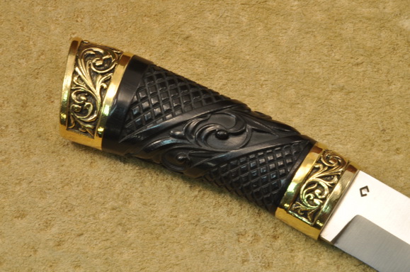 Рукоять: стабилизированный черный граб, резьба, латунь патинированная.