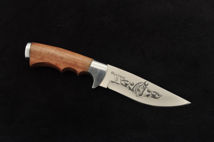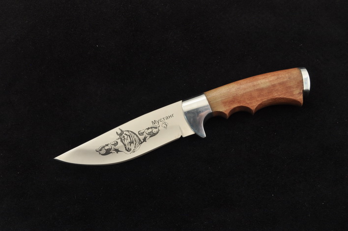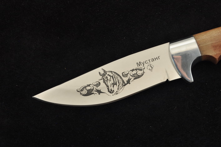 Клинок: нержавеющая сталь 65Х13, спуски бритвенные , гравировка, твердость 55 HRC