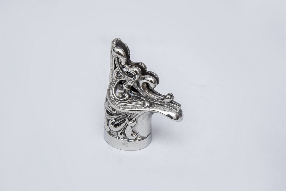 Упор высокий, литье латунь, размеры в мм : сечение ручки 17х19, высота 41, передняя часть - прорезь под конус шириной в верхней части 2,1, длина 29, стенки ажурные. Размеры могут незначительно отличаться от указанных. Литье не обработано, может иметь неровности,: требует шлифовки, полировки, подгонки отверстия под клинок.