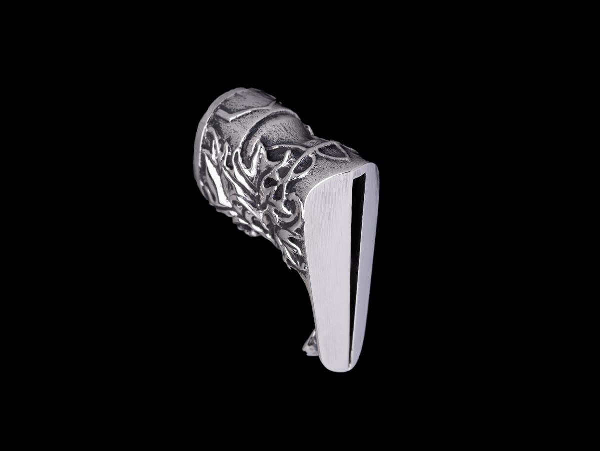 Упор высокий, литье латунь, размеры в мм : сечение ручки овал 15х19, высота 27, передняя часть конус шириной 13-19, длина 33, прорезь под конус шириной 2,5-1, длина 31, отверстие под хвостовик 2х14. Размеры могут незначительно отличаться от указанных. Литье не обработано, может иметь неровности,: требует шлифовки, полировки, подгонки отверстия под клинок.