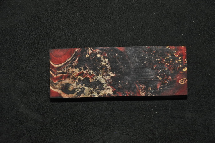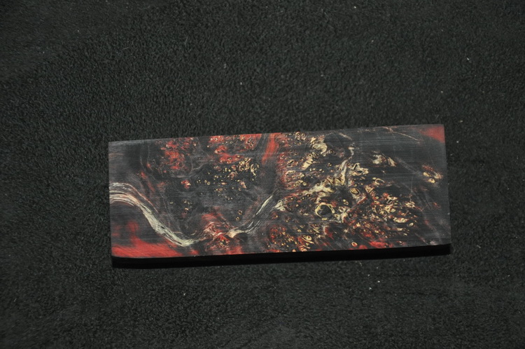 Кап клена, древесина пропитана на всю глубину пропитывающим и окрашивающим составом, имеются непрокрашенные участки. Непрокрас в данном случае вызывается повышенной смолистостью некоторых участков капа, и является эффектом, усиливающим художественную ценность заготовки, непрокрашенные участки стабилизации не поддаются, данный брусок может считаться частично стабилизированным, вес до стабилизации 130 после 216 грамм.