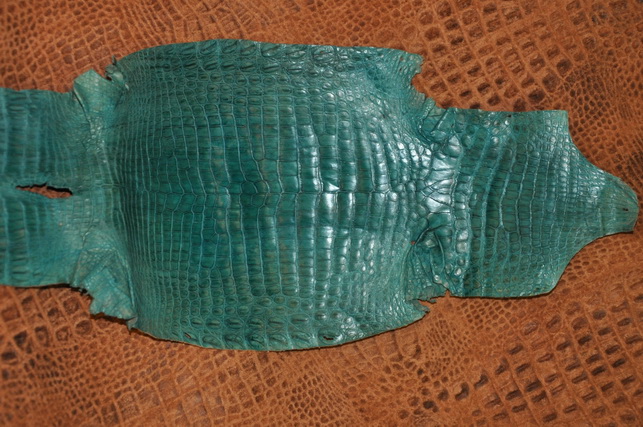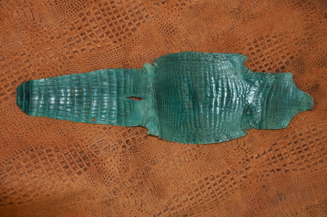 Шкура крокодила натуральная , живот с хвостом , цвет зеленый , размер максимум 200х600 мм.