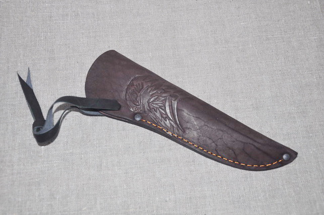 Ножны всадные якутского типа , коньячный цвет с тиснением Коршун, внутренний размер ножен 45х225 мм., внешний 70х240 мм, подвес - кожаный шнур. Ножны универсальные, могут использоваться с любым ножом без сильно выступающего упора.