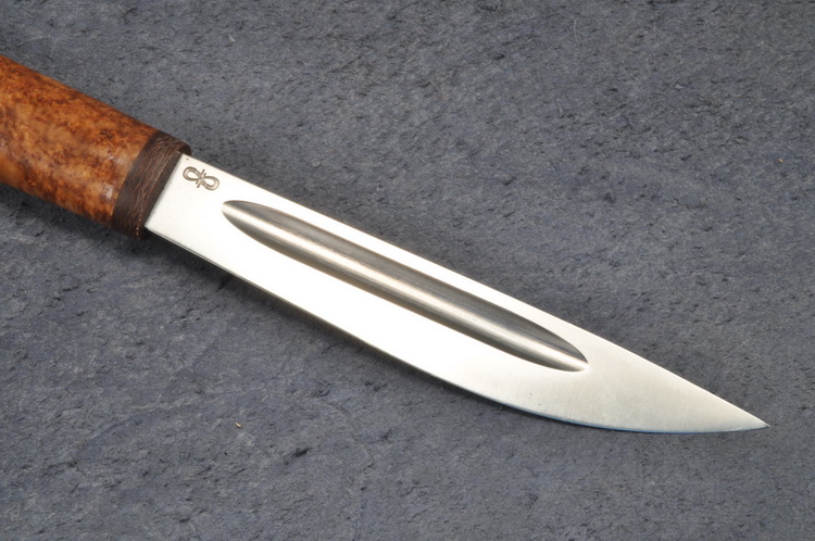 Клинок: нержавеющая сталь 110Х13М , спуски в якутском стиле, асcиметричные : прямой/линза, односторонний дол, твердость 57