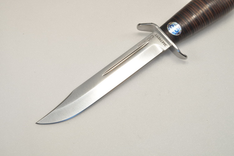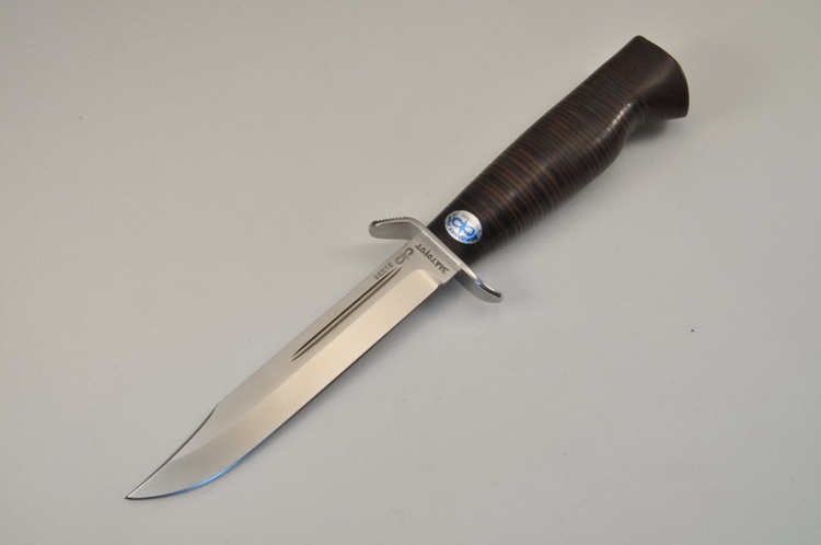 В продаже златоустовский нож - универсальный , очень легкий , средней величины нож с развитой стальной гардой классического типа. Нож прекрасно сбалансирован. Неширокий клинок толщиной 2,4 мм, с обушком популярной формы «лещиком», имеет вогнутые линзовидные спуски на половину ширины клинка, образующие отличное режущее лезвие. На голомени с обеих сторон клинка выбраны узкие долы, добавляющие жесткости клинку. Небольшая эргономичная рукоять прекрасно ложится даже в большую ладонь, чему спосоствует расширенная головка рукояти . Монтаж клинка сквозной не разборный. Прототипом ножа является «нож разведчика» образца 1940 г. Заслуженно пользуется популярностью у широкого круга покупателей.