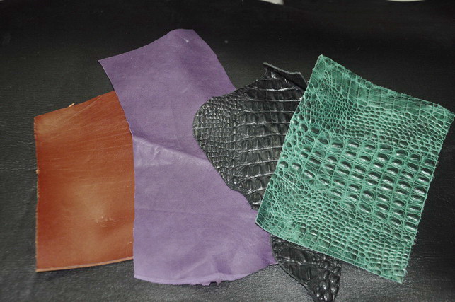 Набор кожи из разноформатных кусков 4-х разных цветов, общим форматом не менее А4 . Коричневая кожа шорная, размер 4х170х170 мм. Остальные куски - тонкая галантерейная кожа, толщина 1 мм.